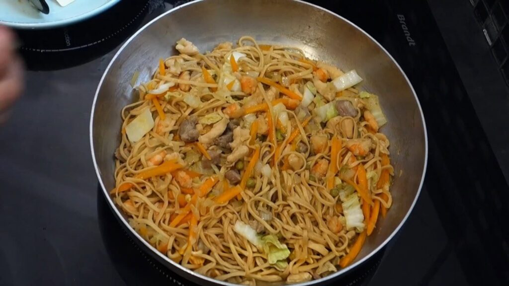 It’s made with wide Chinese soft wheat noodles stir-fried with chicken, pork, shrimp and vegetables like Chinese cabbage, carrots, onions and peas. The meat and shrimp are marinated in a mix of soy sauce, oyster sauce, garlic, ginger and rice starch which gives it that classic flavor. Everything gets cooked quickly over high heat.