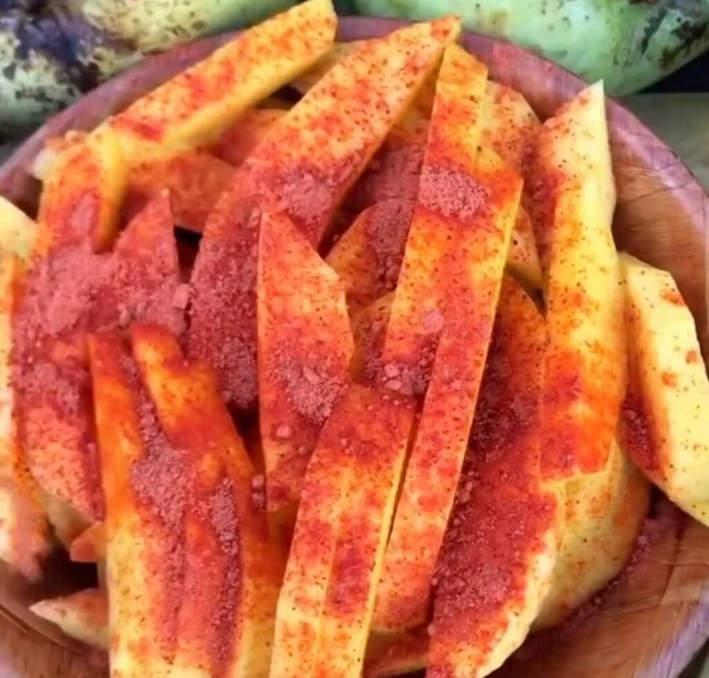 To make it, you peel and cut green mangoes into quarters, then sprinkle them with the powder, salt, sugar, vinegar and a bit of water. Mix it all together and let it sit in the fridge for at least an hour so the flavors really soak in.